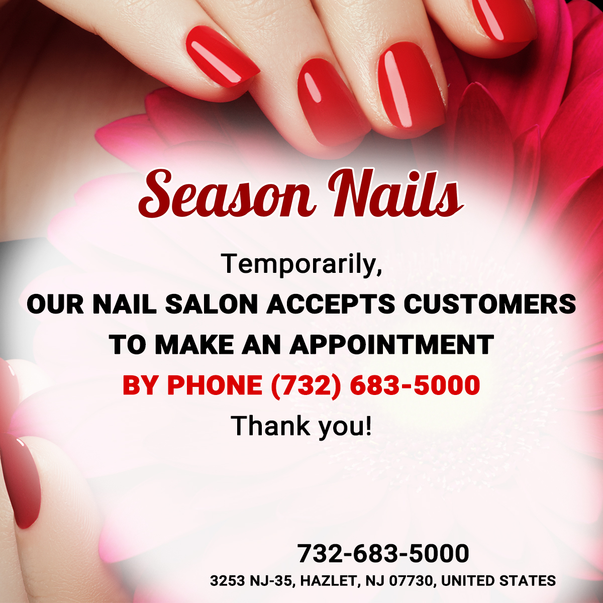Located conveniently in Hazlet, New Jersey 07730, Season Nails is proud to be one of the best nail salons with many high-quality products. Our nail salon is the ideal destination for you to immerse yourself in a luxury environment.